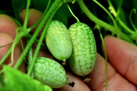 拇指西瓜:学名佩普基诺,仅有3厘米长。内瓤为青绿色,口感如黄瓜般清脆爽口,营养价值比普通西瓜高,可直接食用。