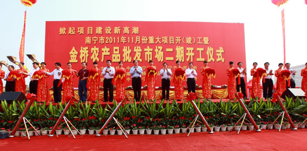 11月7日,南宁金桥农产物批发市场二期开工典礼在南宁市昆仑大道进行。南宁市人大常委会主任谢寿堂,南宁市政协主席岑可成,广西交通投资团体有限公司董事长、党委书记余昌文,南宁市委副书记刘长林,自治区商务厅副厅长熊家军,南宁市委常委、秘书长杨维超及兴宁区四家班子率领等出席典礼??さ淅裼赡夏形N?、常务副市长吴炜主持。